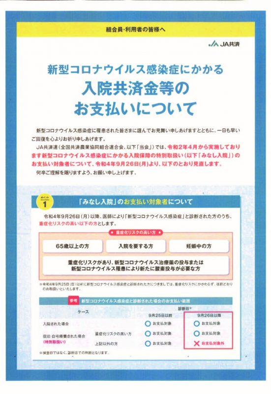 新型コロナウイルス感染症にかかる入院共済金等のお支払いについて