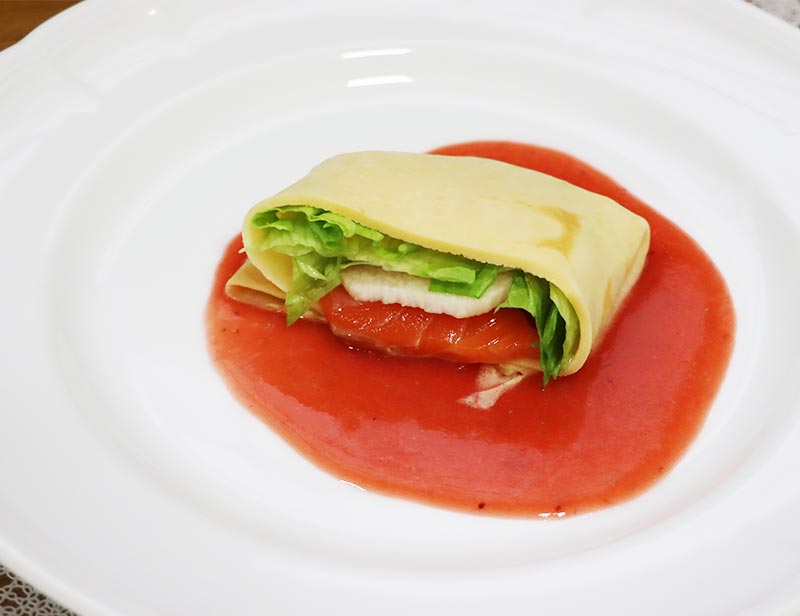 クレープ包みのあまおうソースかけ