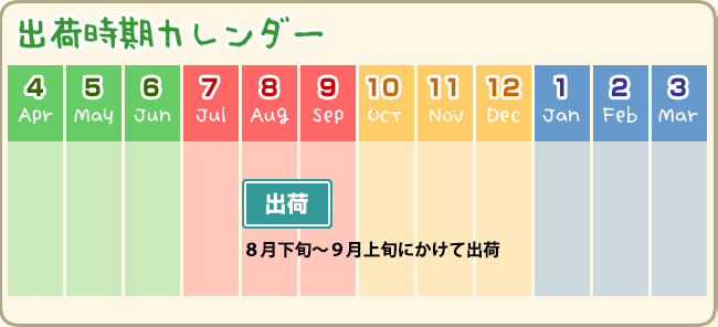紹介 品種は巨峰のみを取り扱っています。 出荷期間は約一ヶ月と短いですが、有明海の潮風を受け育った巨峰は糖度が高く、甘みがあり、とても人気があります。 また年に一度、農薬の安全・適正使用などについての講習会を開き、安心安全なぶどうの生産に努めています。 出荷時期カレンダー